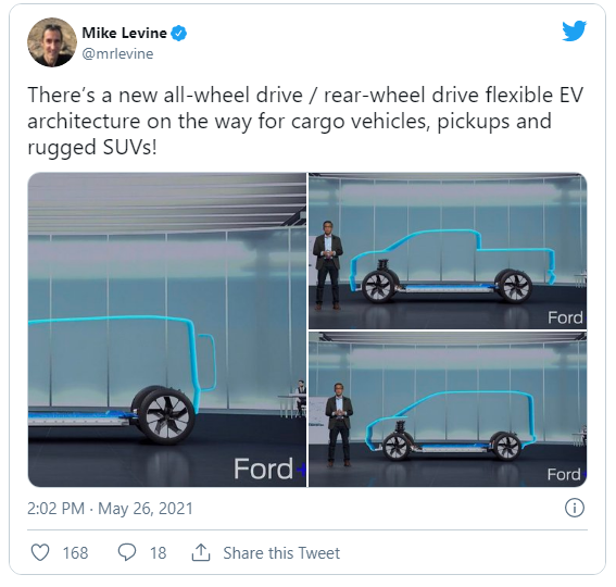 Levine svaraði sjálfur sínu eigin tísti og lét þá í veðri vaka að verið væri að þróa „alveg nýjan rafdrifinn pallbíl í fullri stærð“. „Það hljómar eins og næsti F-150 Lightning sé þegar á teikniborðinu.