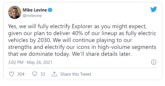 Auk rafmagnaðra frétta af Bronco skveraði hann út öðru tísti: „Já, við munum rafvæða Explorerinn og það verður hluti af þeirri áætlun okkar um að vera með 40% framleiðslu okkar rafdrifnar bifreiðar fyrir árið 2030.