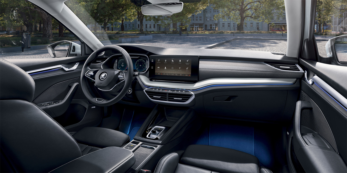 Tveggja pílára stýrið er hér að birtast sem frumraun í framleiðslu Skoda og veitir ökumanni aðgengi að 14 mismunandi aðgerðum. Sé sjálfskiptingin valin er búið að skipta stórri gírstönginni í eldri Octaviunni út fyrir lítinn valflipa, líkt og í Golf. LED lýsing á hurðarspjöldum og mælaborðinu verður boðin í 10 völdum litum, eins og nýlega þróað valfrjálst hljóðkerfi, og allt að fimm USB-C tengjum hefur verið bætt við 230V rafmagnsinnstungu.