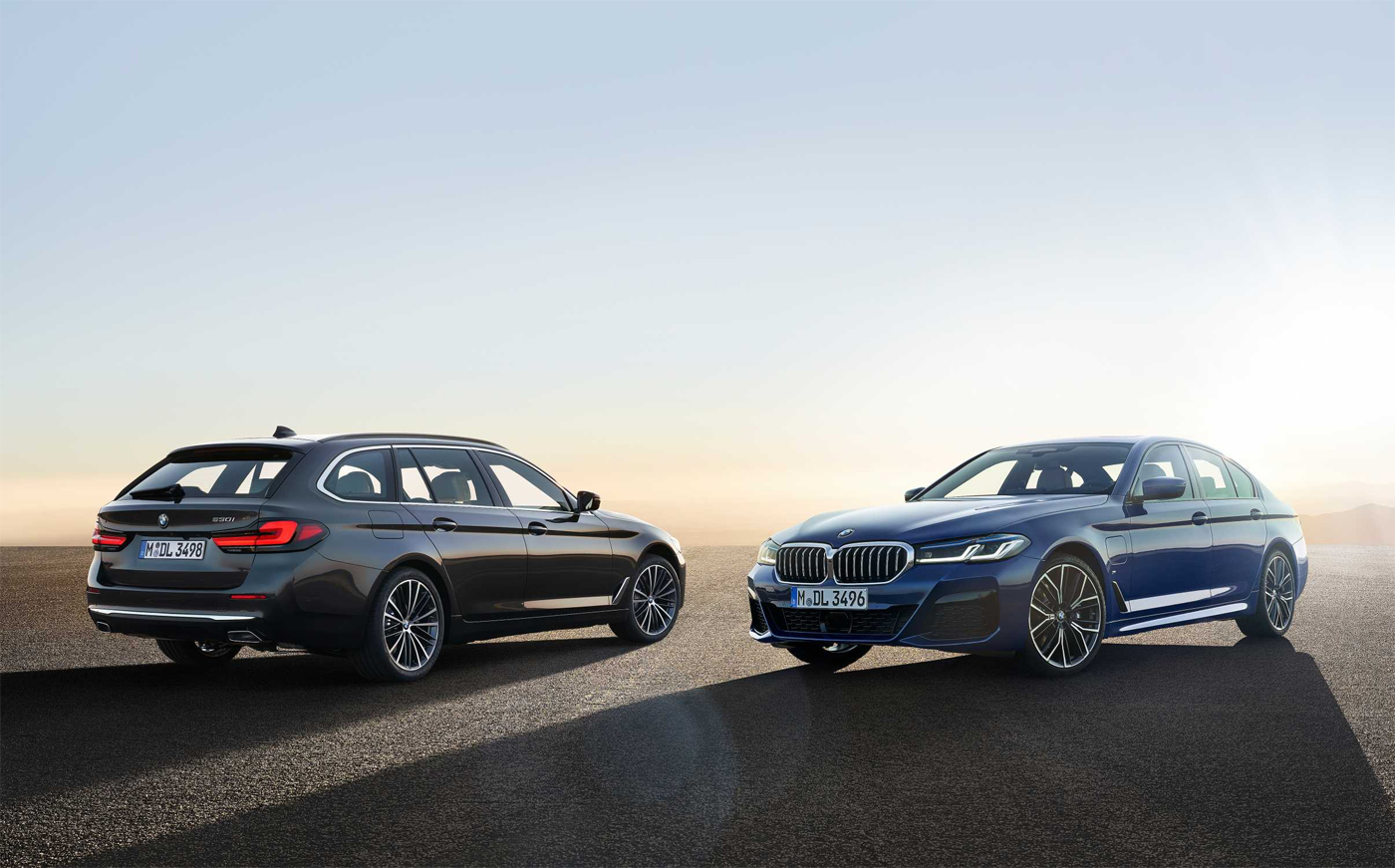 Hybrid sviðið eykst í fimm gerðir: nýjasta kynslóð BMW eDrive tækni sem nú er einnig boðin fyrir BMW 5 Series Touring. BMW 530e Touring (eldsneytisnotkun, samanlagt: 2,1 – 1,9 l / 100 km; raforkunotkun, sameinuð: 15,9 – 14,9 kWst / 100 km; CO2 losun, samanlagt: 47 – 43 g / km) , BMW 530e xDrive Touring (eldsneytisnotkun, samanlagt: 2,3 – 2,1 l / 100 km; raforkunotkun, samanlagt: 16,9 – 15,9 kWst / 100 km; CO2 losun, samanlagt: 52 – 49 g / km) og BMW 545e xDrive Sedan (eldsneytisnotkun, samanlagt: 2,4 – 2,1 l / 100 km; raforkunotkun, sameinuð: 16,3 – 15,3 kWst / 100 km; CO2 losun, samanlagt: 54 – 49 g / km) með sex strokka línubrunavél fáanleg frá og með haustinu 2020. Ný BMW eDrive Zone aðgerð – staðalbúnaður fyrir allar gerðir með innbyggðum blendingum/hybrid – skiptir bílnum sjálfkrafa yfir í rafmagnsstillingu þegar farið er inn í „græn svæði“.