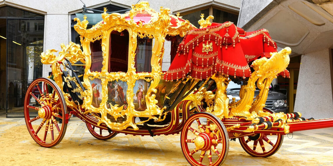 Jafnvel þótt “Gold State Coach” sé ekki úr skíragulli heldur úr gylltum viði, þá er það til vitnis um hæsta stigi handverks. Vagninn var smíðaður af Samuel Butler í London árið 1762, heill með stórum skúlptúrum og skrauti á þakinu (sem tákna England, Skotland og Írland), og hefur verið notað fyrir nánast allar konunglegar krýningar síðan Georg IV konungur var krýndur.