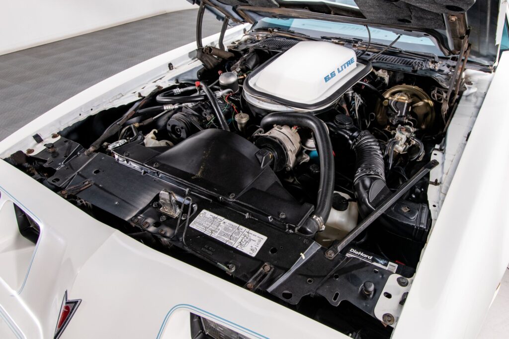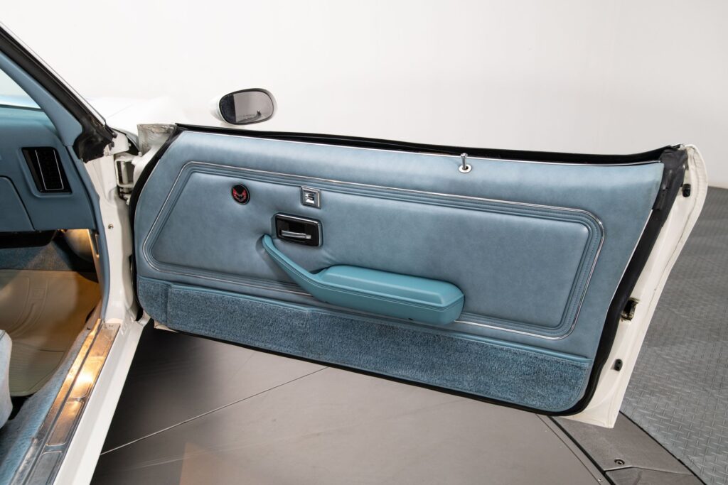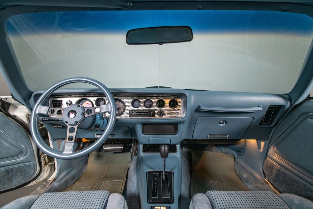 Það er rafmagn í rúðum og rafmagn í læsingum, hraðastillir og orginal Cameo White málning með bláum strípum og orginal Trans Am merkingum. 15 tommu Pontiac Snowflake felgur eru usíðan undir þessum fallega bíl.