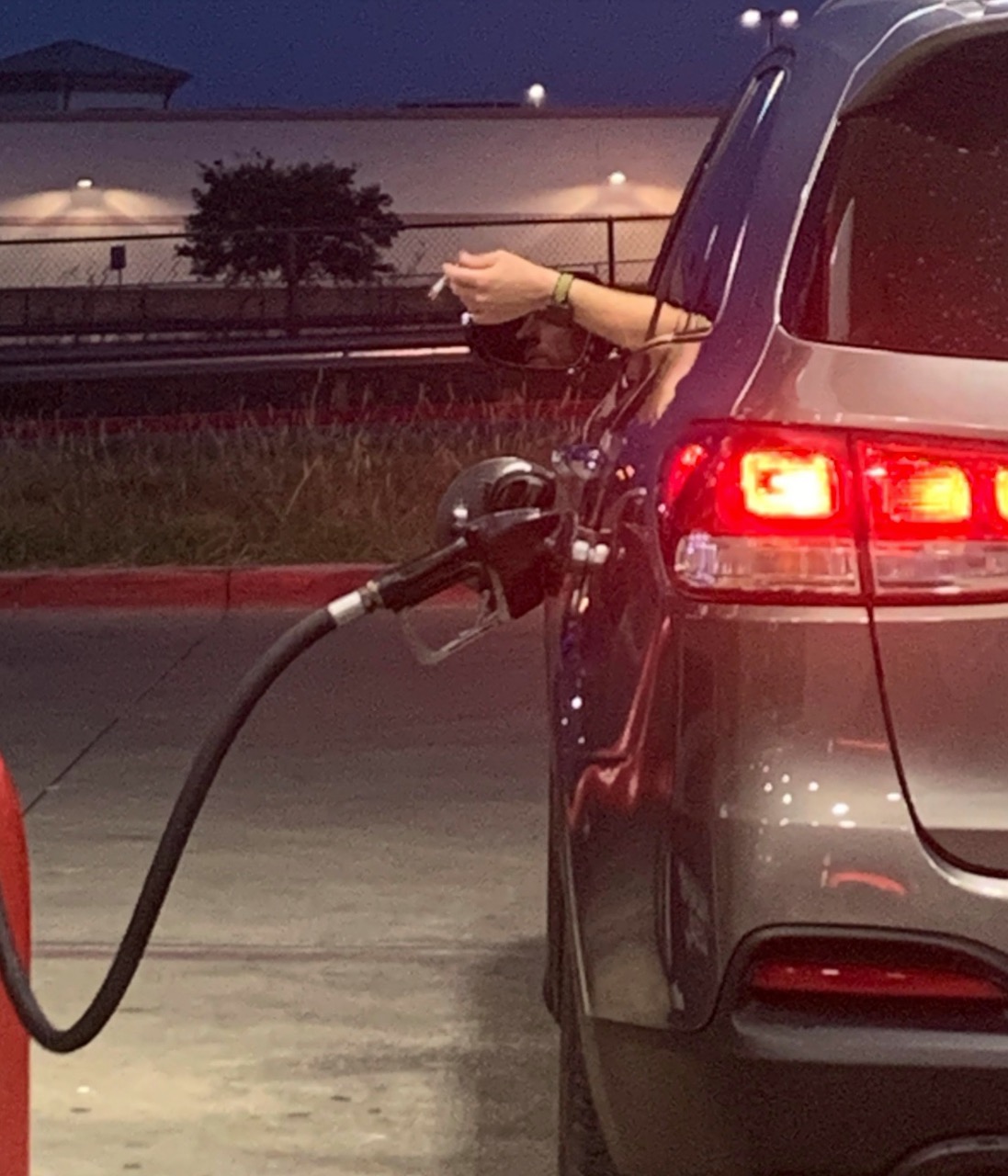 Þarna er efnahvarfameistari að undirbúa eigið brotthvarf. Nei, vandinn er að hann hefur sennilega ekki hugmynd um hversu hræðilega vond hugmynd er að reykja á bensínstöð, láta dæluna og bílinn ganga og skapa kjöraðstæður með eldinn í kjaftinum og opið út… Æj, best að segja ekki meira.