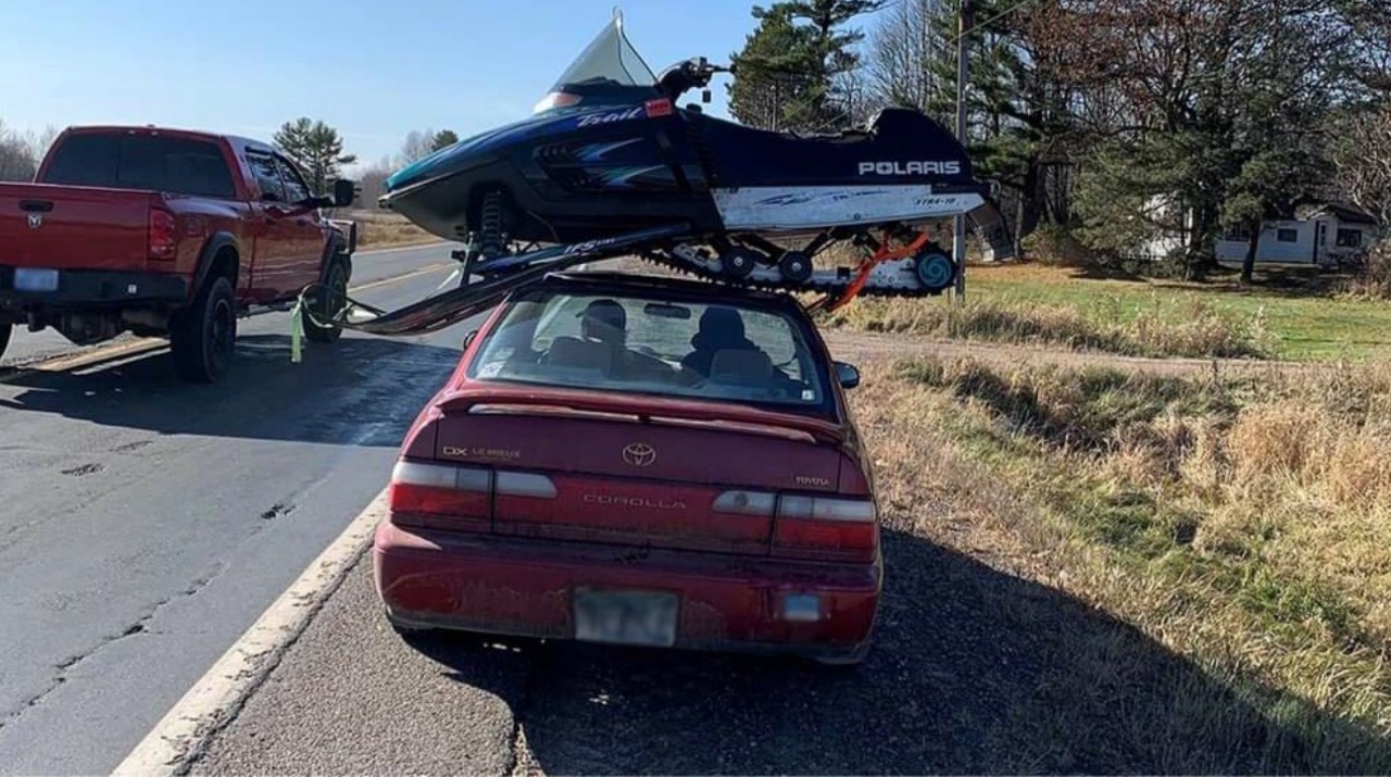 Fyrst snjó bar á góma þá er hér einmitt vélsleði sem virkar fínt í snjó. Ef það er ekki snjór þá er bara svo gott að hafa hann hjá sér. Til dæmis uppi á bílþaki.