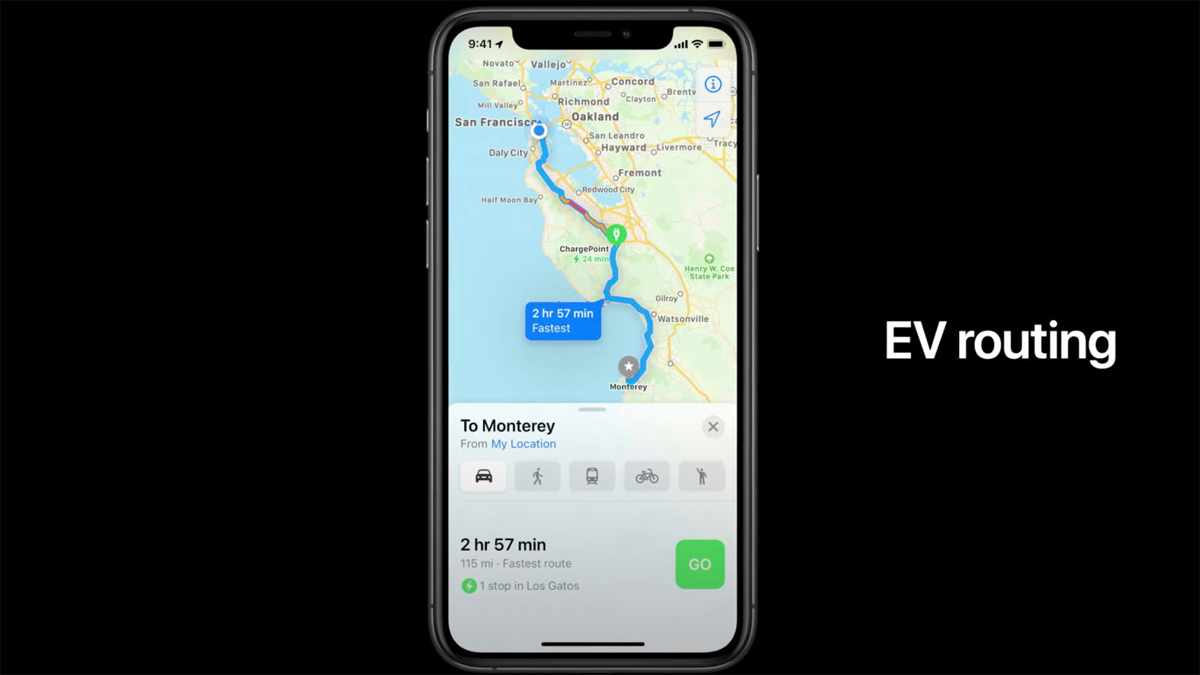 Apple uppfærði einnig Apple kort með upplýsingum um hleðslustöðvar rafknúinna ökutækja og vann með BMW og Ford til að sýna stöðvar sem samrýmast ökutæki notandans. Aðgerðin er kölluð EV Routing. Það mun stinga upp á sérstökum EV leiðum sem taka tillit til hleðslustöðva.