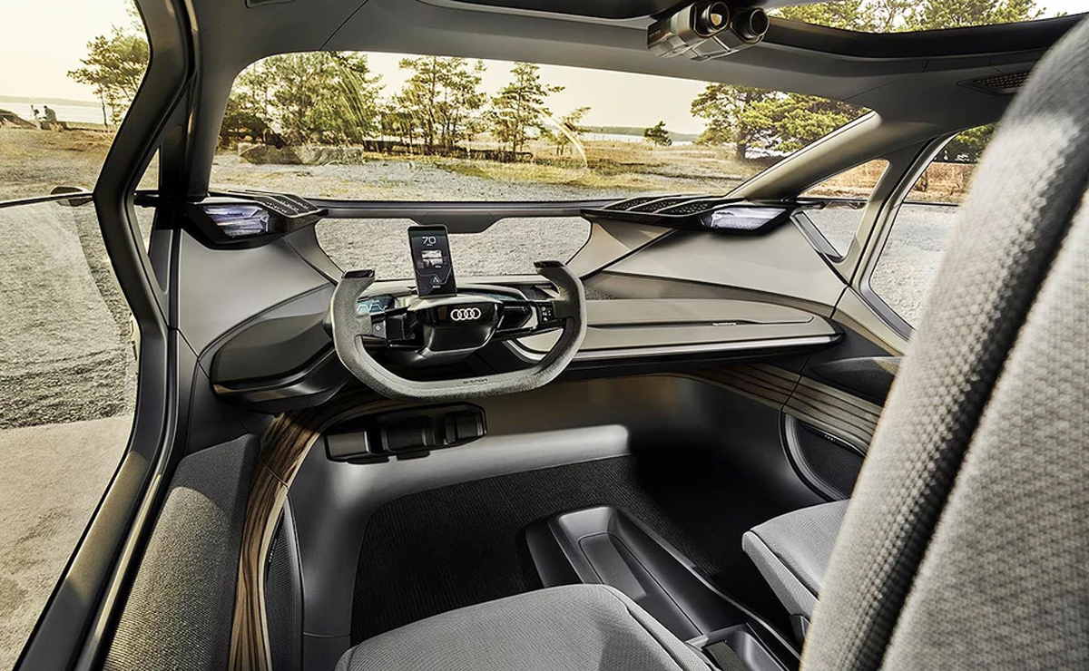 Audi hannaði bílinn með að í huga að farþegar væru meira að einbeita sér að í útsýninu en bílnum sjálfum og því stækkuðu þeir gluggasvæðið og skar niður fjölda skjáa.