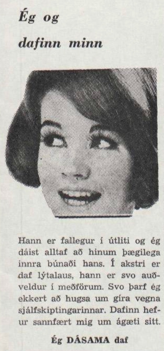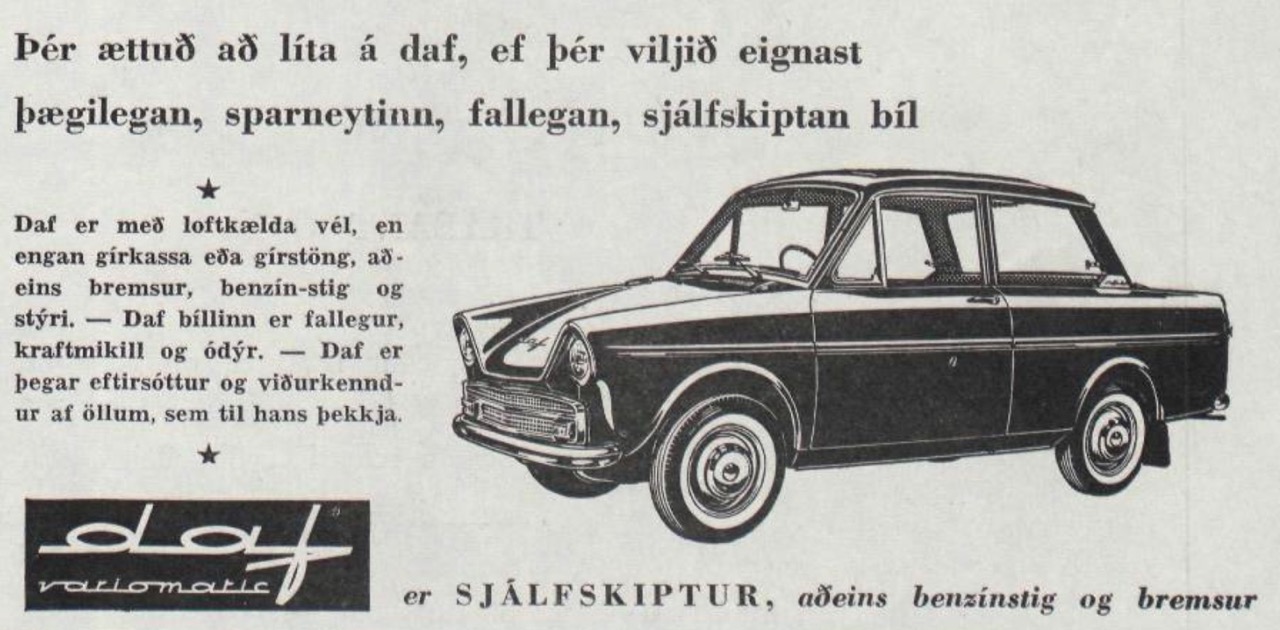 Aldrei prófaði ég nú Daf en heillaðist af honum þegar ég var á flakki um Kaplahraunið í Hafnarfirðinum. Þangað fór ég stundum 14 ára gömul á reiðhjóli og tók myndir af bílum. Ég fann því miður ekki ljósmyndina sem ég tók árið 1995 af Daf en hins vegar fann ég auglýsingu frá 1964: