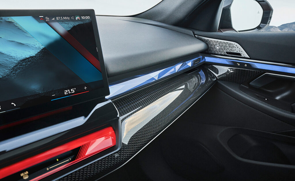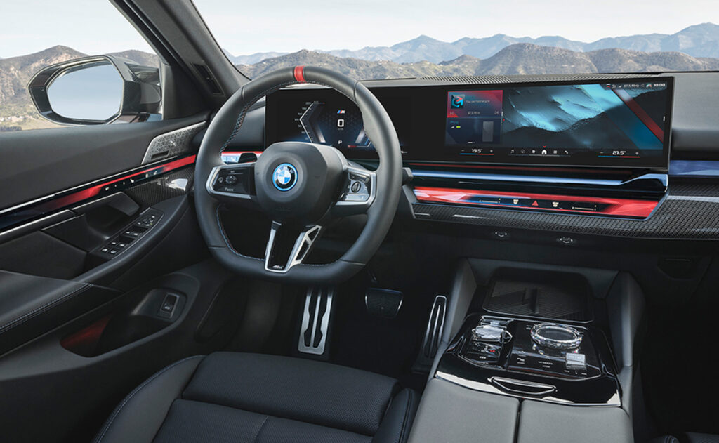 Að innan eru 5 Series og i5 með bogadregnum skjá yfir efst á mælaborðinu sem er með 12,3 tommu skjá fyrir framan ökumann og 14,9 tommu snertiskjá í miðju mælaborðinu.