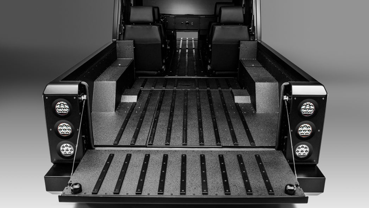 Hálf-gamall, hálf-eitthvað heldur áfram að innan með kringlóttum, krómuðum hliðstæðum mælum sem eru felldir inn í flatt mælaborð, loftop sem eru í laginu eins og tunnur og þriggja pílára stýrishjól án loftpúða. Bollinger hefur ekki útskýrt hvernig hann gerir ráð fyrir að flutningabílar þess standist bandarískt árekstrarpróf eins og það er, heldur beinir athyglinni að snjallri gegnumferð sem teygir sig frá framhlið bílsins að afturenda. Þar er nægt pláss til að flytja hluti pirrandi langa hluti eins og timbur og veiðistangir.