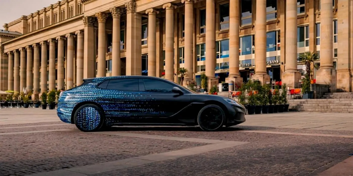 Þó að bíllinn sé falinn undir felulitum má sjá flotta, loftaflfræðilega hönnun bílsins. Vörumerkið segir að hreina, straumlínulaga hönnunin nái hámarki „í rafmagnsglæsileika sem er sportlegur en þó lúxus“.
