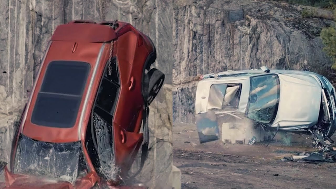 Það er ekki sérlega langt síðan að Volvo lét nokkra splunkunýja bíla falla niður úr krana sem hífði bílana í nokkra hæð. Sá gjörningur var fyrst og fremst til að kanna áhrif slíks falls á skemmdir en einnig til að rannsaka áhrif fallsins á ökumann og farþega.