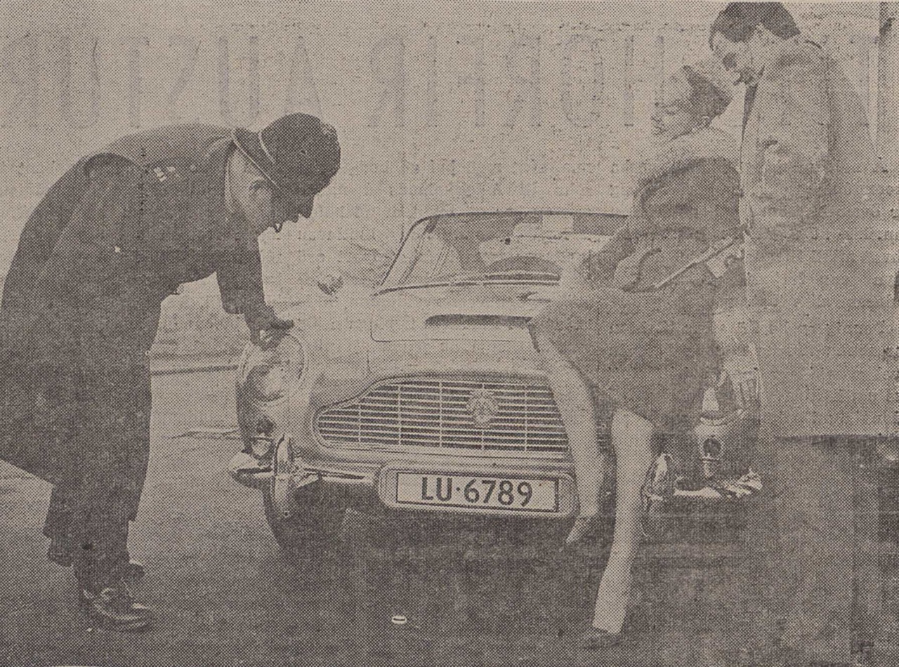En, flýtti Ashley sér að útskýra, þetta var allt löglegt; þessi silfurgrái, 15.000 punda sportbíll hans var sá, sem notaður var í James Bond kvikmyndinni „Goldfinger“ og það átti að fara að setja hann um borð í skip í Southampton og flytja hann til Ameríku til að nota hann þar í auglýsingaskyni fyrir myndina. Ashley starfar hjá Aston Martin bílasmiðjunum, sem smíðuðu þennan gagnmerka bíl.“