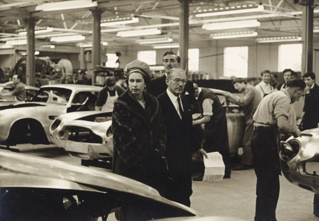 Ætli Ashley hafi haldið vinnunni hjá Aston Martin? Þá hefur hann kannski hitt bifvélavirkjann; sjálfa drottninguna árið 1966.