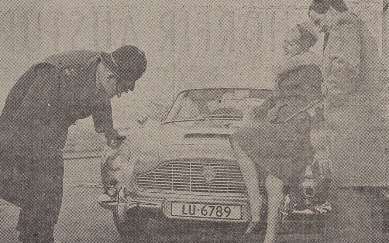 En, flýtti Ashley sér að útskýra, þetta var allt löglegt; þessi silfurgrái, 15.000 punda sportbíll hans var sá, sem notaður var í James Bond kvikmyndinni „Goldfinger“ og það átti að fara að setja hann um borð í skip í Southampton og flytja hann til Ameríku til að nota hann þar í auglýsingaskyni fyrir myndina. Ashley starfar hjá Aston Martin bílasmiðjunum, sem smíðuðu þennan gagnmerka bíl.“