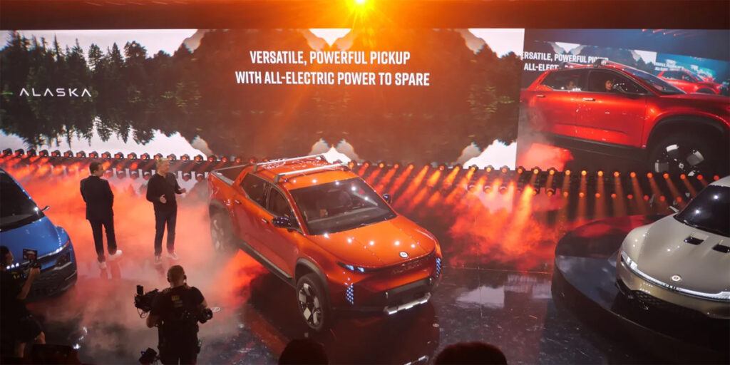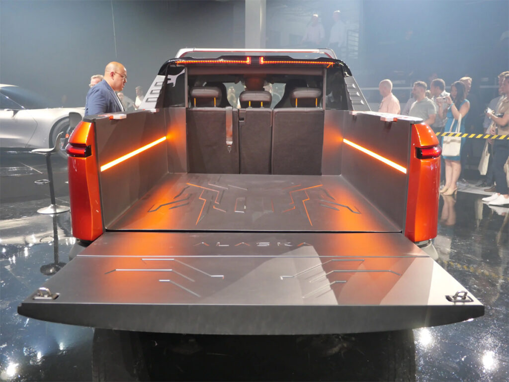 Alaska lítur út fyrir að vera settur fram sem „ævintýrabíll“ frekar en vinnubíll – svona frekar sem Rivian R1T, ekki Ford F-150 Lightning. Þó að ekki sé vitað um tæknimálin ennþá, þá er hann greinilega miklu minni en Rivian (kannski nær væntanlegum R2 Rivian).