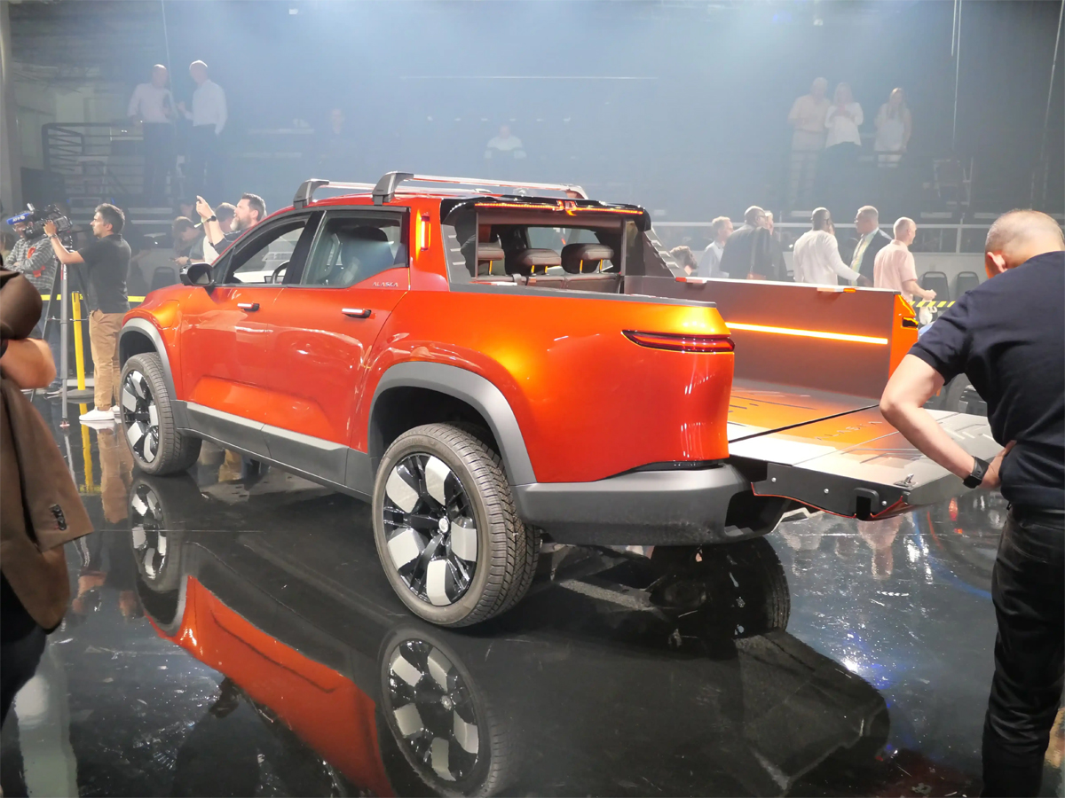 Alaska lítur út fyrir að vera settur fram sem „ævintýrabíll“ frekar en vinnubíll – svona frekar sem Rivian R1T, ekki Ford F-150 Lightning. Þó að ekki sé vitað um tæknimálin ennþá, þá er hann greinilega miklu minni en Rivian (kannski nær væntanlegum R2 Rivian).