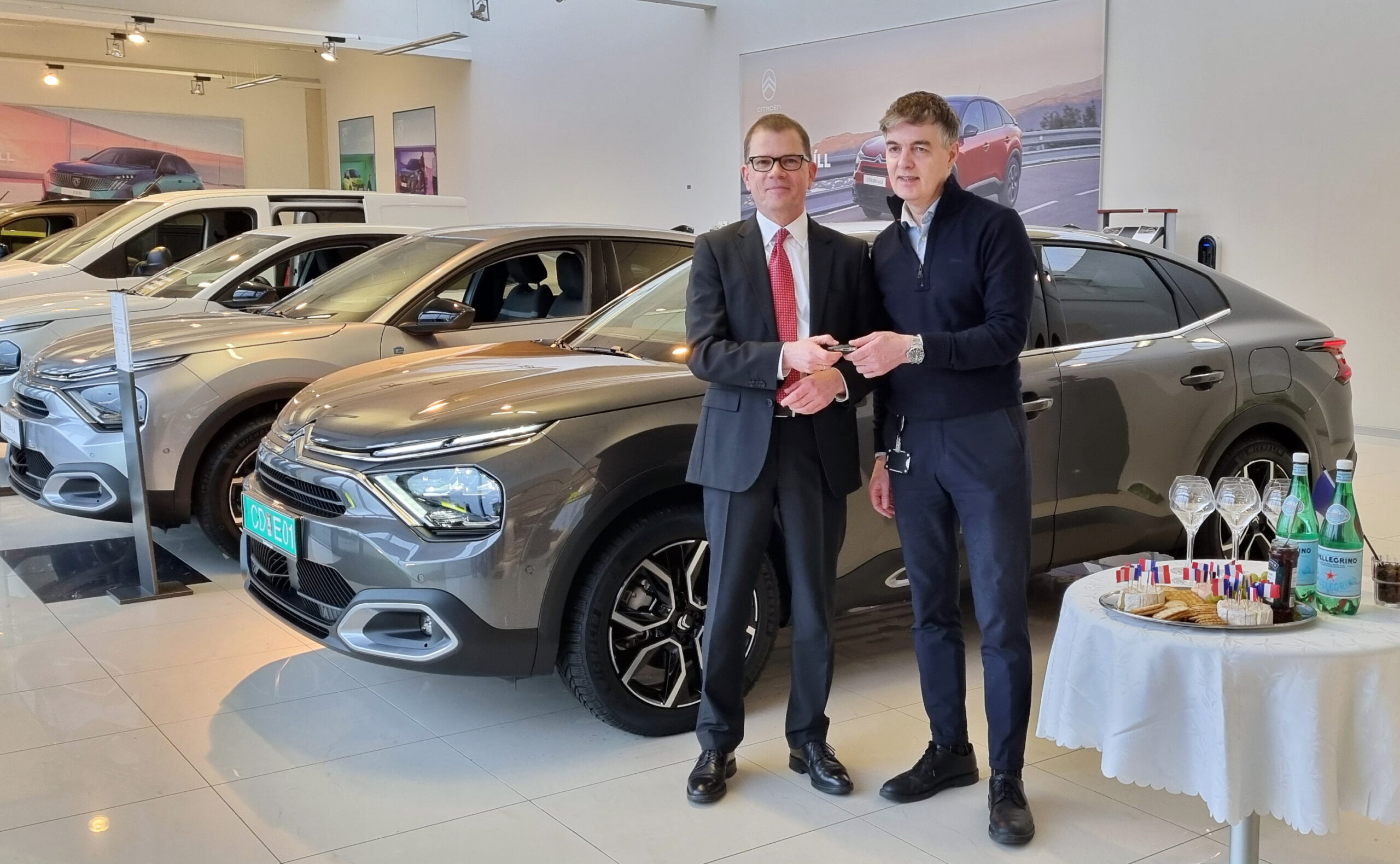 Franski sendiherrann Guillaume Bazard tók við lyklunum hjá Citroën á Ísland að nýjum sendiráðsbíl í Brimborg í dag. Fyrir valinu varð franski lúxusrafbíllinn Citroën Ë-C4 X.