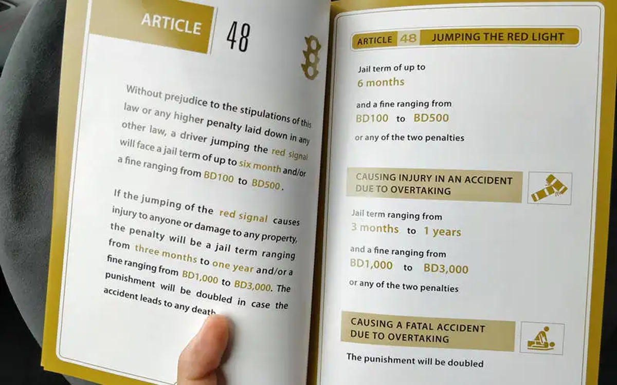 Í Barein geta lögreglumenn dæmt fangelsisdóma fyrir næstum öll umferðarlagabrot. Einhver sem keyrir yfir á rauðu ljósi á á hættu að eyða allt að sex mánuðum í fangelsi, borga 500 dínar (um 1.000 pund) sekt eða fá dæmdar tvær refsingar. Að skemma eignir á meðan á rauðu ljósi stendur er refsing allt að eins árs fangelsi og sekt sem getur numið 3000 dínarum (um £6100).