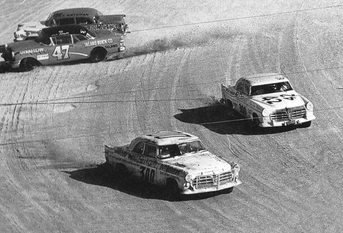 Bílar Kiekhaefer-liðsins báru höfuð og herðar yfir marga keppinauta sína og hér má sjá tvo þeirra þjóta framhjá tveimur GM-bílum á Daytona-ströndinni; Buick og Oldsmobile, en ökumenn þeirra virðast hreinlega hafa missa alla stjórn á akstrinum.