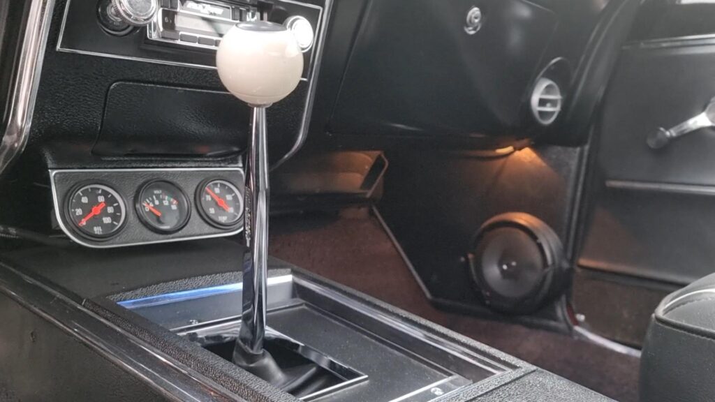 Vélin í bílnum er ekki í máttlausari kantinum – 5.7 lítra / 350 cubic í 4 bolta blokk. Edelbrock „heitur kambás” með vökvaundirlyftum, potthedd með víkkuðumm inn og útgöngum.
