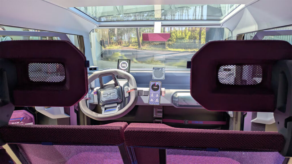 Innrétting Dacia Hipster – Innrétting Hipster er með lágmarkssætum. Hægt er að festa fylgihluti eins og farsíma ökumannsins við mælaborðið. (PETER SIGAL/AUTOMOTIVE NEWS EUROPE)
