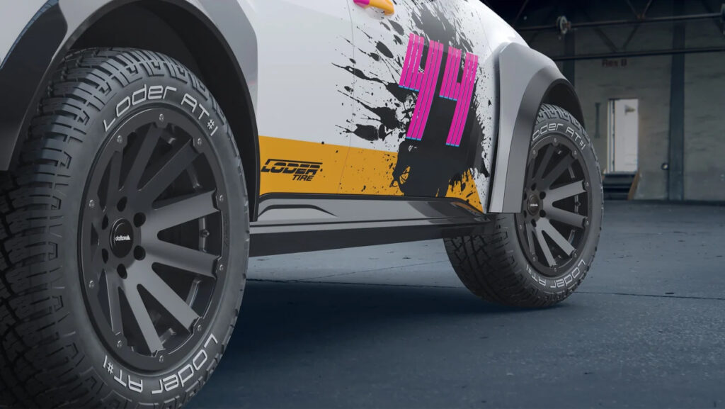 Breytingar á glæsilega rafmagnssmábílnum fela í sér 100 mm fjöðrunarlyftu, sem ekki aðeins bætir veghæðina til muna, heldur veitir einnig nægilegt pláss fyrir þykk 18 tommu Loder AT#1 jeppadekk. Mun stærri hjólbogar munu einnig hjálpa til við það.