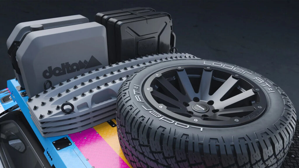 Fjórar PIAA-kastarar eru að framan, innblásnir af Renault 5 rallýbílum frá níunda áratugnum sem líklega höfðu áhrif á líflega grafík hugmyndarinnar. Á sama tíma býður þakgrindin upp á nægilegt pláss fyrir það sem lítur út eins og varahjól í fullri stærð, ófærðarplötur og allt annað sem þú þarft í óbyggðunum.