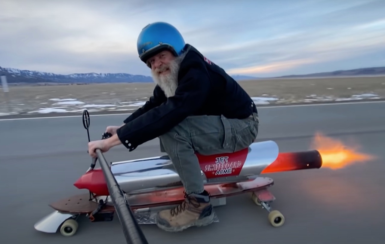 Ónei! Hvað gerir hann núna? Crazy Rocket-man er enn á ferðinni og að sjálfsögðu er allt rauðglóandi „undir“ honum… Bob Maddox eða Rocket-man þeysist hér áfram á þotuknúnu hjólabretti á 80 kílómetra hraða í Cederville í Kaiforníu.