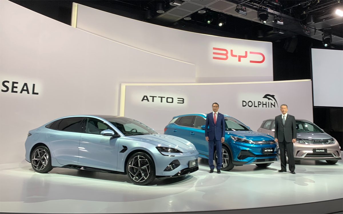Bílar BYD á nýlegri bílasýningu í Kína, frá vinstri Seal, Atto3 og lengst til hægri Dolphin. Atto3 er kominn hingað til lands en Sal og Dolphin verða kynntir í Evrópu á næstunni og væntanlegir til Íslands undir lok ársins