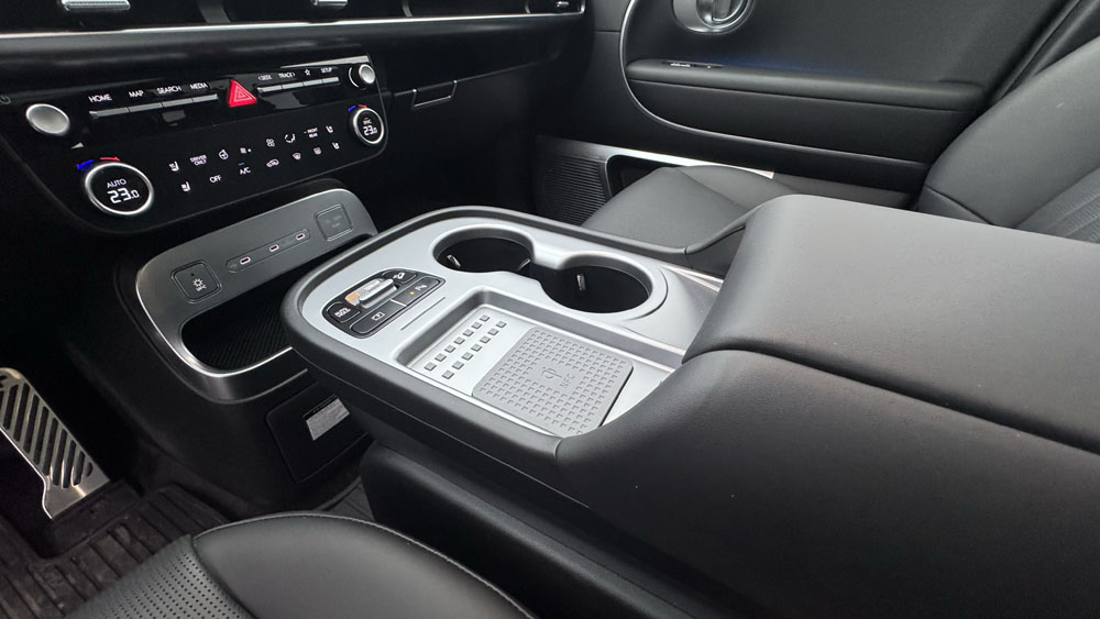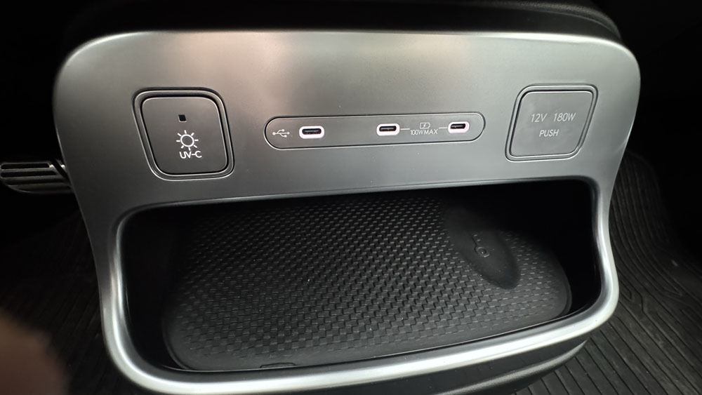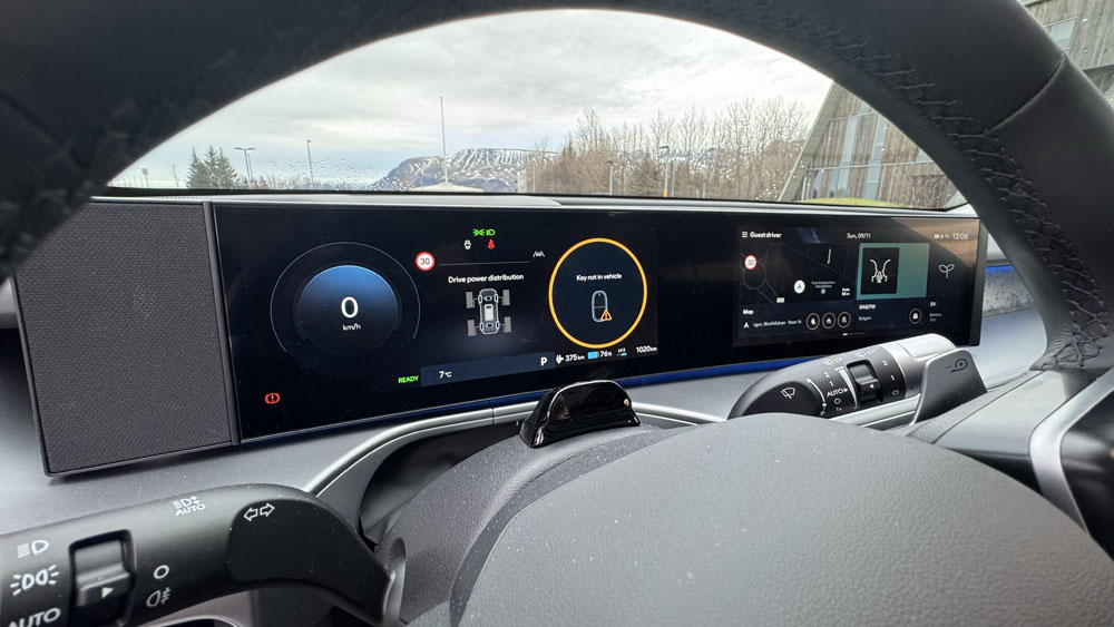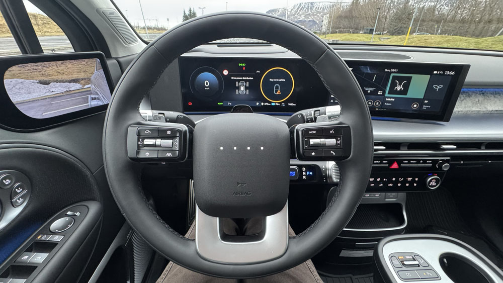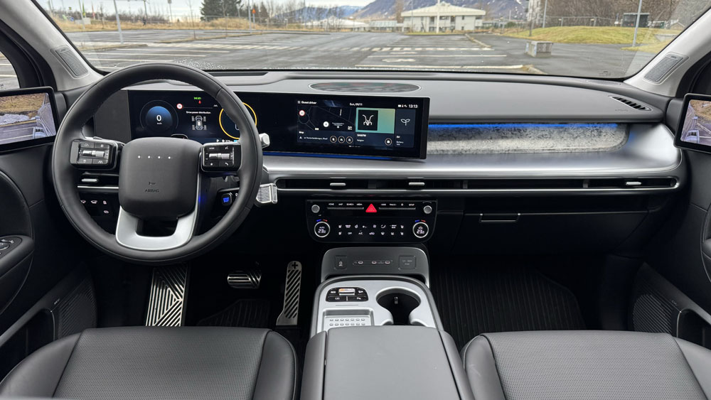 Eitt það besta við bílinn er þó hvernig Hyundai tekst að sameina framtíðar­tækni og hefðbundna notendavænni. Mælaborð og miðjuskjár mynda fallega heild með tveimur 12,3″ skjám, en undir þeim eru alvöru takkar og rofar fyrir helstu stillingar. Þetta er akkúrat sá millivegur sem margir hafa verið að óska sér: fullkomin tækni, án þess að allt verði háð snertiskjánum.