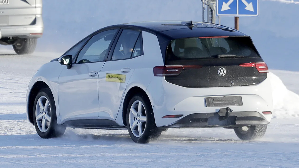 Þessar nýjustu njósnamyndir sýna það sem gæti verið ID.2-bíl í prófun við vetraraðstæður. Þó að það sé að nota yfirbyggingu frá ID.3 getum við séð að „prufubíllinn“ er með miklu minni felgur og stærra hjólabil, sem myndi gefa til kynna lítinn crossover.
