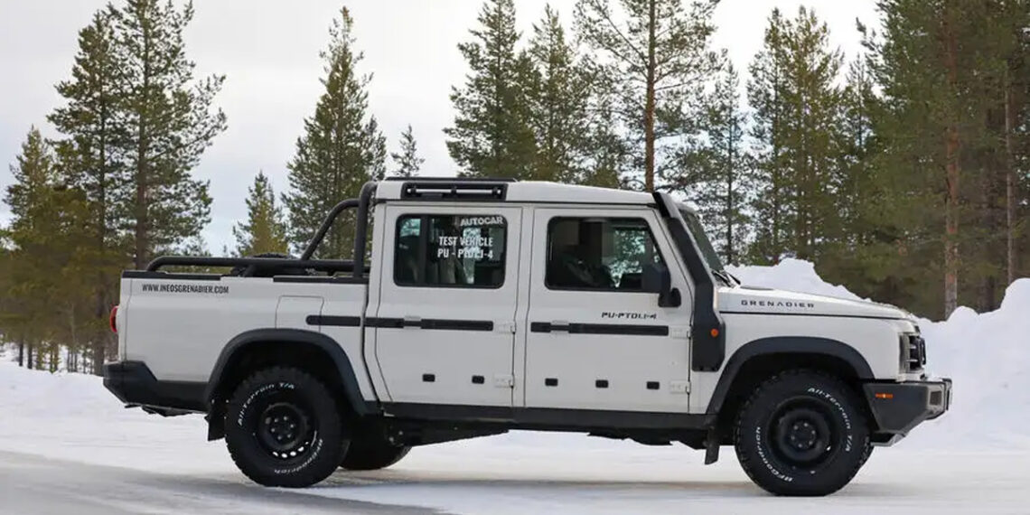Væntanlegur pallbíll Ineos sást án hvers kyns „felulita”, með stórum alhliða dekkjum, sem ýtir undir vangaveltur um að hann verði jafn fær utan vega og systkini hans í jeppastíl.