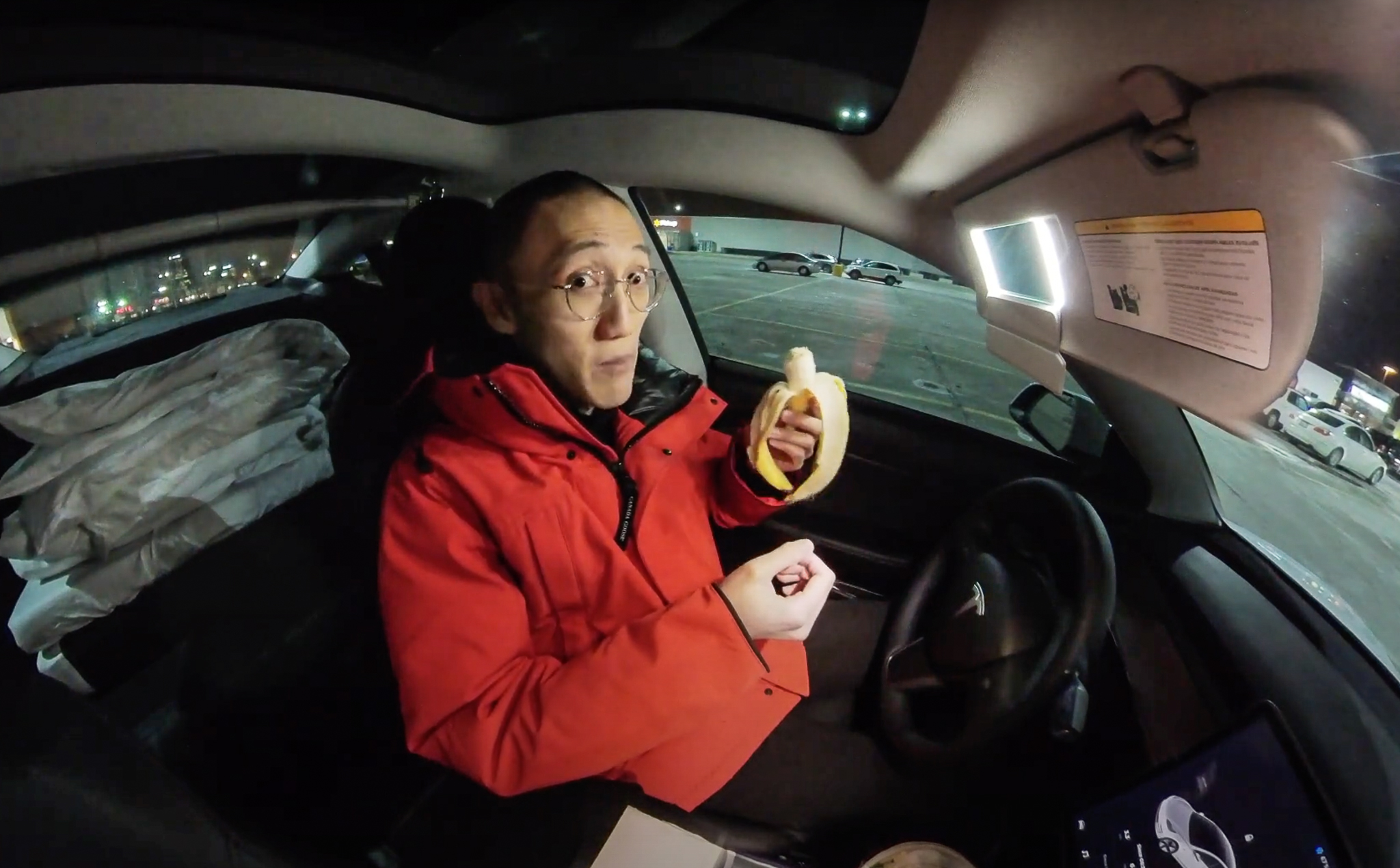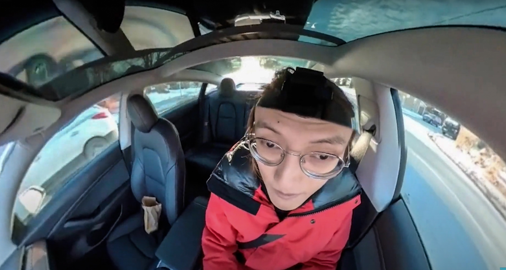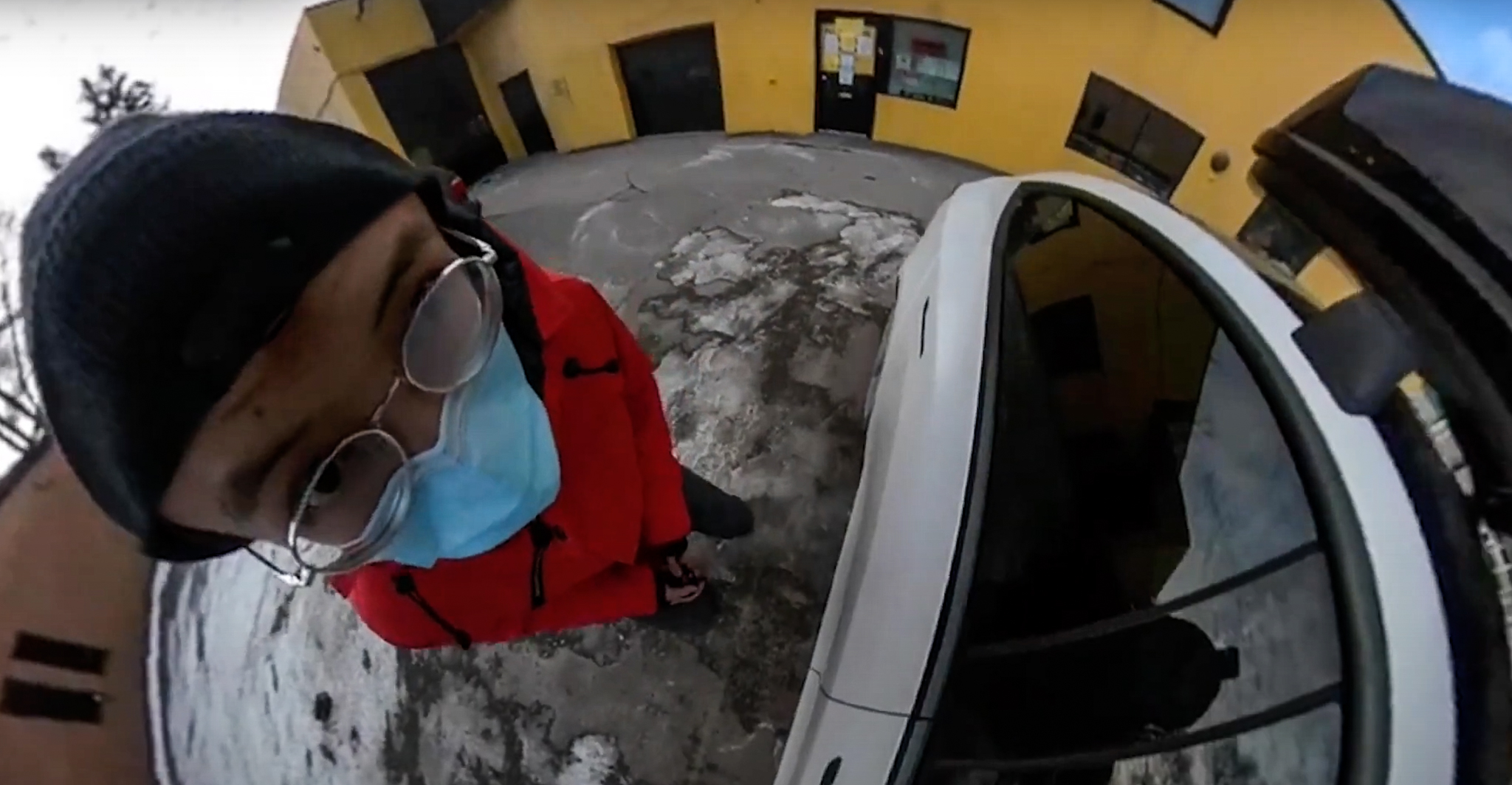 Hann virkar dálítið spes, blessaður strákurinn þar sem hann paufast úti í frostinu með grímuna á sér, gleraugun mikið til þakin móðu, og hann að kvikmynda sjálfan sig við bílinn. Og sér væntanlega ekki glóru auk þess sem hann er krókloppinn í kanadískum brunagaddi.