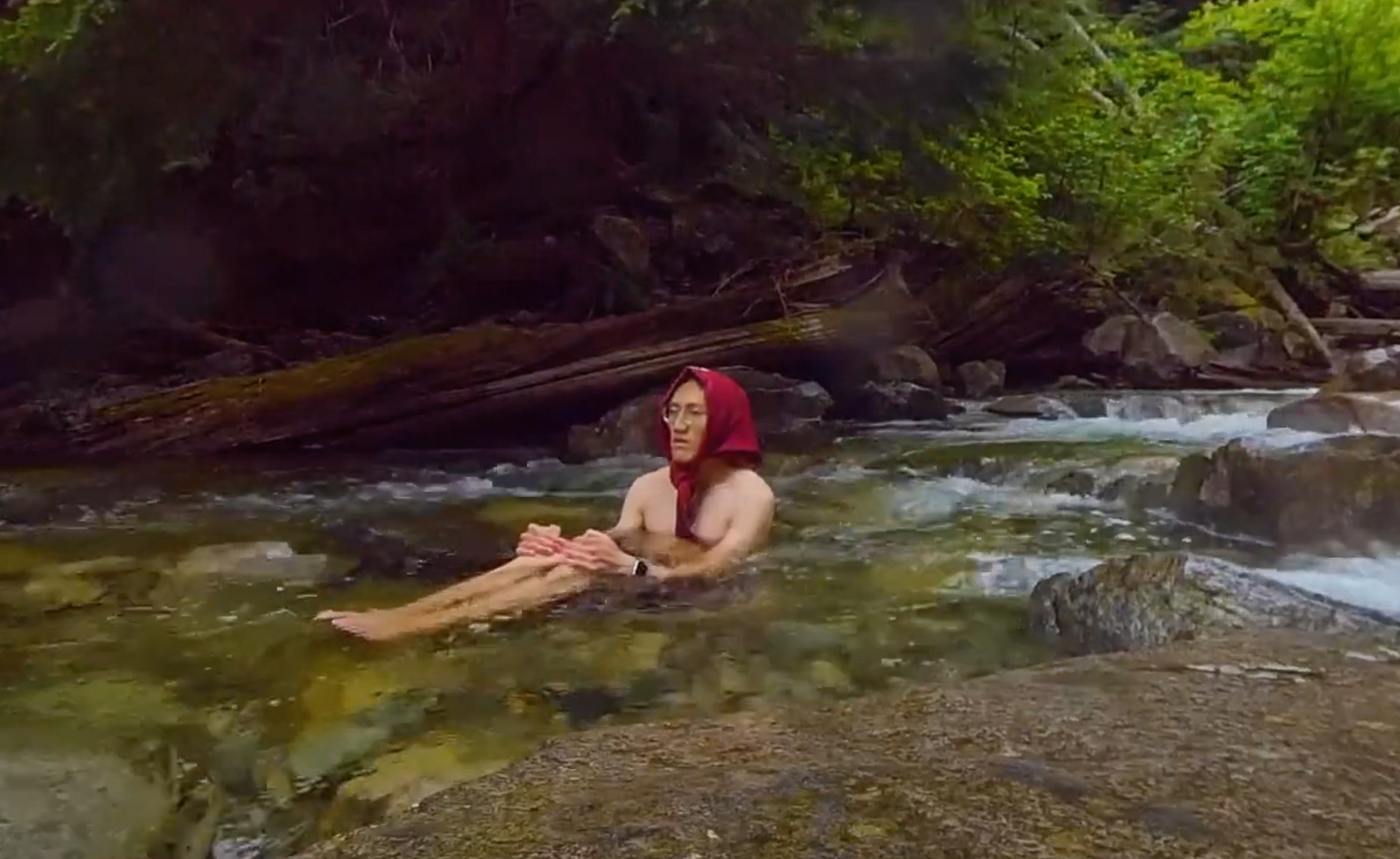 Ískaldur og hálfgrátandi settist hann á klöpp, leyfði skrokknum að þorna í sólinni og hugleiddi uns hann náði valdi á eigin þankagangi. Í myndbandinu má sjá hann nánast ganga sér til húðar.