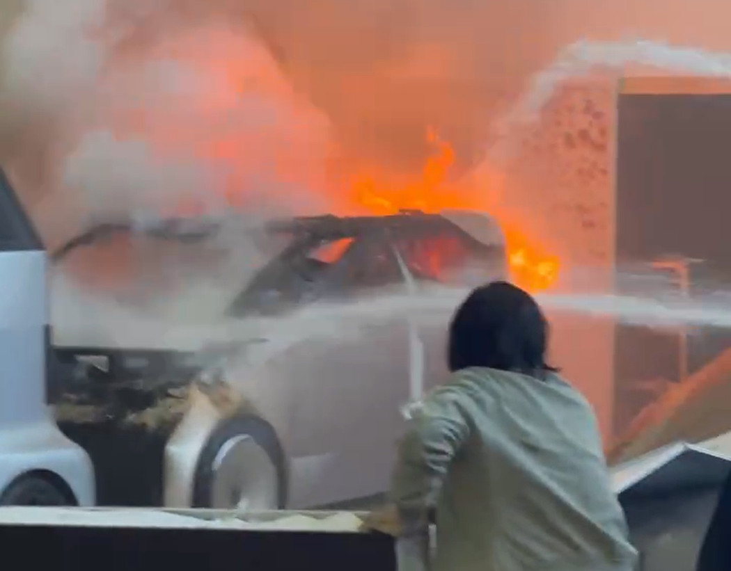 Bílablaðamaður/podcaster, Lei Xing, á sýningunni náði nokkrum myndum af farartækinu og myndbandi af eldinum.