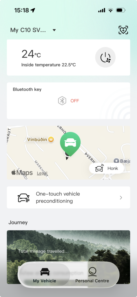Rýmið er eitt af sterkustu atriðum C10. Gott hjólabil, skilar sér í mjög góðu fótarými bæði fram í og aftur í. Ég sat þægilega fyrir aftan bílstjórasætið sem var stillt fyrir mig áður, sem er alltaf gott próf. Farangursrýmið er um 435 lítrar og lítið frunk er til staðar fyrir hleðslukapla. Þetta er greinilega bíll hannaður með fjölskyldur í huga.