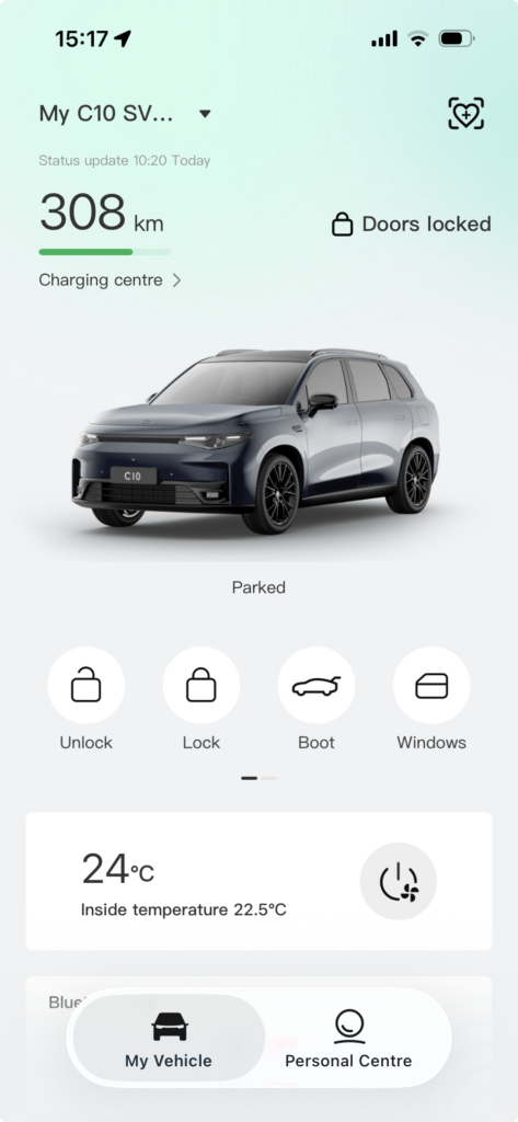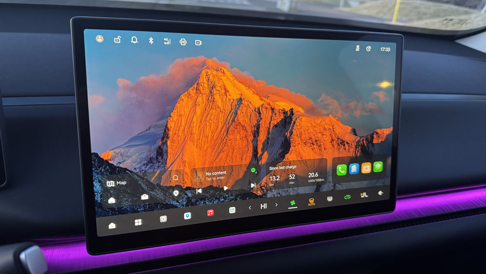 Innanrýmið í C10 kemur skemmtilega á óvart. Hér ríkir skjádrifin rafbílastemning með fáum hefðbundnum tökkum. Fyrir framan ökumann er 10,25 tommu stafrænt mælaborð og í miðjunni 14,6 tommu snertiskjár sem stjórnar flestum kerfum bílsins.