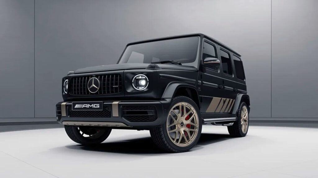 Í heildina notar Mercedes þessa gulllituðu áferð á stuðarainnlegg að framan og aftan, undirvagnsvörn að neðan, AMG merki, Mercedes stjörnu, Affalterbach merki á húddinu og hringinn utan um varadekkjahlífina.