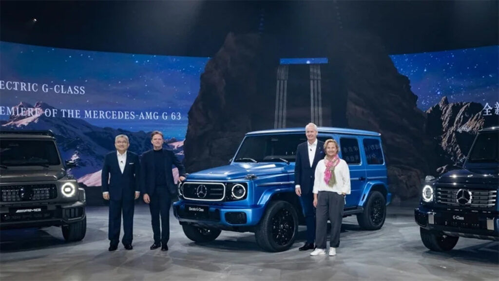 Mercedes G-Class frumsýndur á bílasýningunni 2024 í Beijing. Forráðamenn Mercedes á sviðinu við afhjúpun rafmagns G-Class á bílasýningunni. Mynd: MICHAEL GERSTER