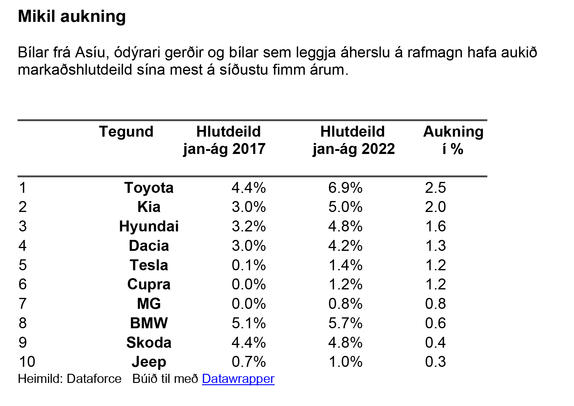 Stærstu sigurvegararnir voru Toyota, Kia – hver hefur bætt við sig tveimur prósentum eða meira af markaðshlutdeild síðan 2017 – á eftir Hyundai, Dacia og Tesla, samkvæmt tölum frá markaðsrannsóknum Dataforce (sjá töflu hér að neðan).