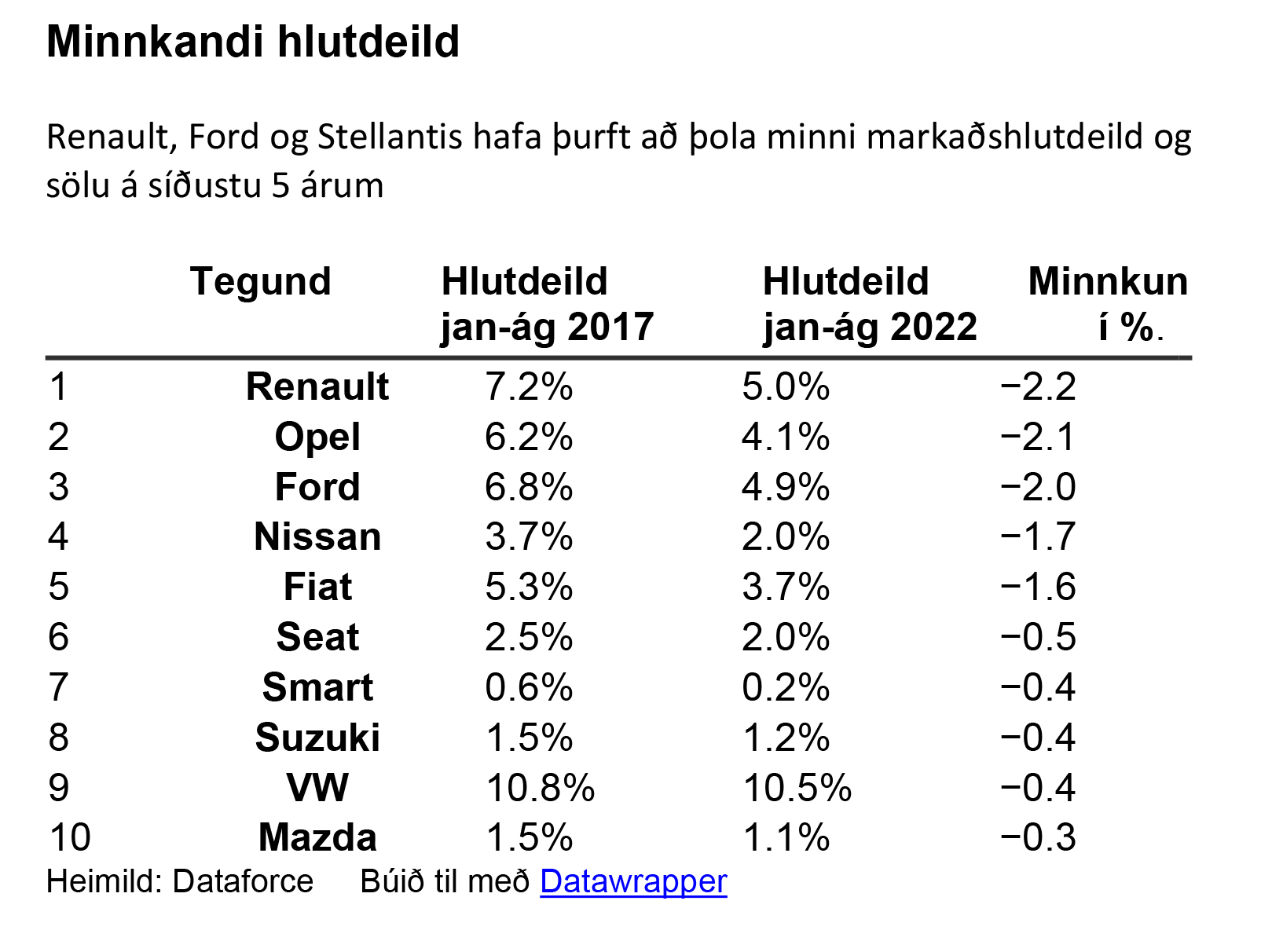 Samhliða Renault voru þau vörumerki sem misstu mestan hlut á fimm ára tímabilinu Opel, Ford, Nissan og Fiat.