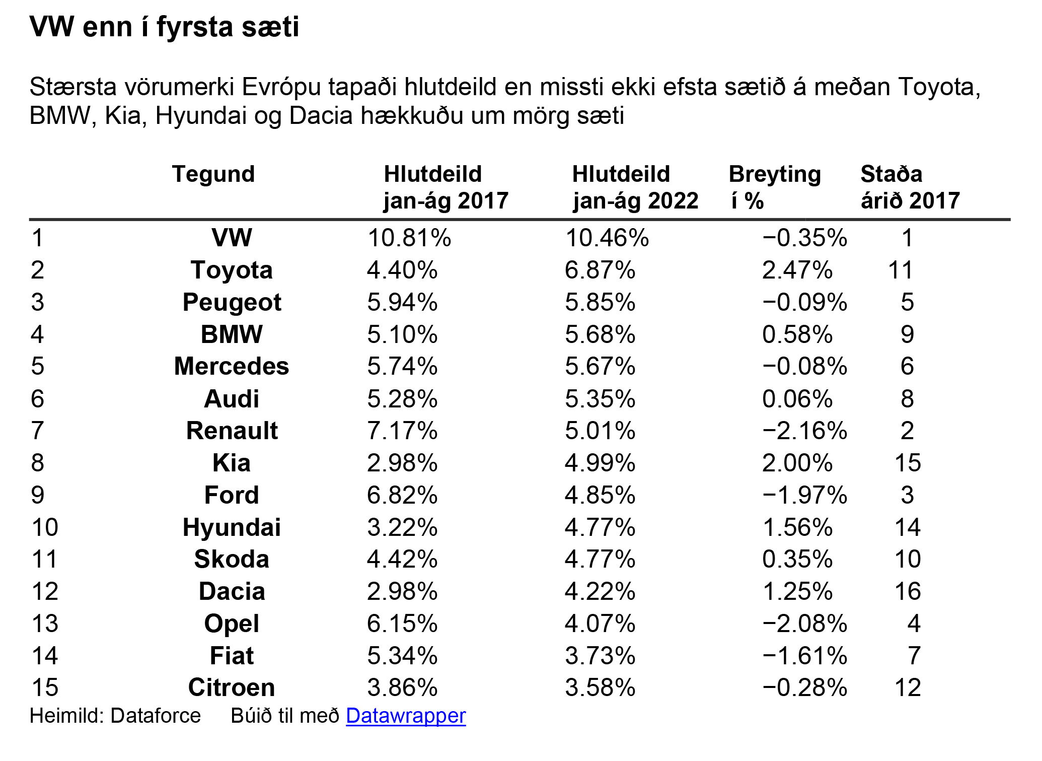 - Toyota, Hyundai, Dacia, Tesla hækka; Renault, Opel, Ford missa hlutdeild í Evrópu