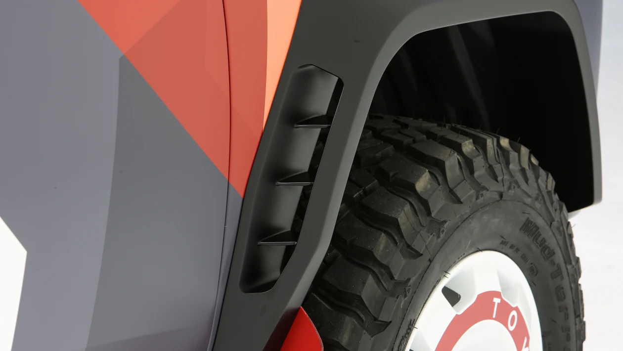 Sett af hvítum, steyptum 17 tommu álfelgum undirstrikar enn frekar rally-útlitið, með torfærudekkjum. Eins og Toyota GR86 Rally Legacy Concept sem einnig er sýndur á SEMA, fær RAV-X sett af feitletruðum rauðum aurhlífum.