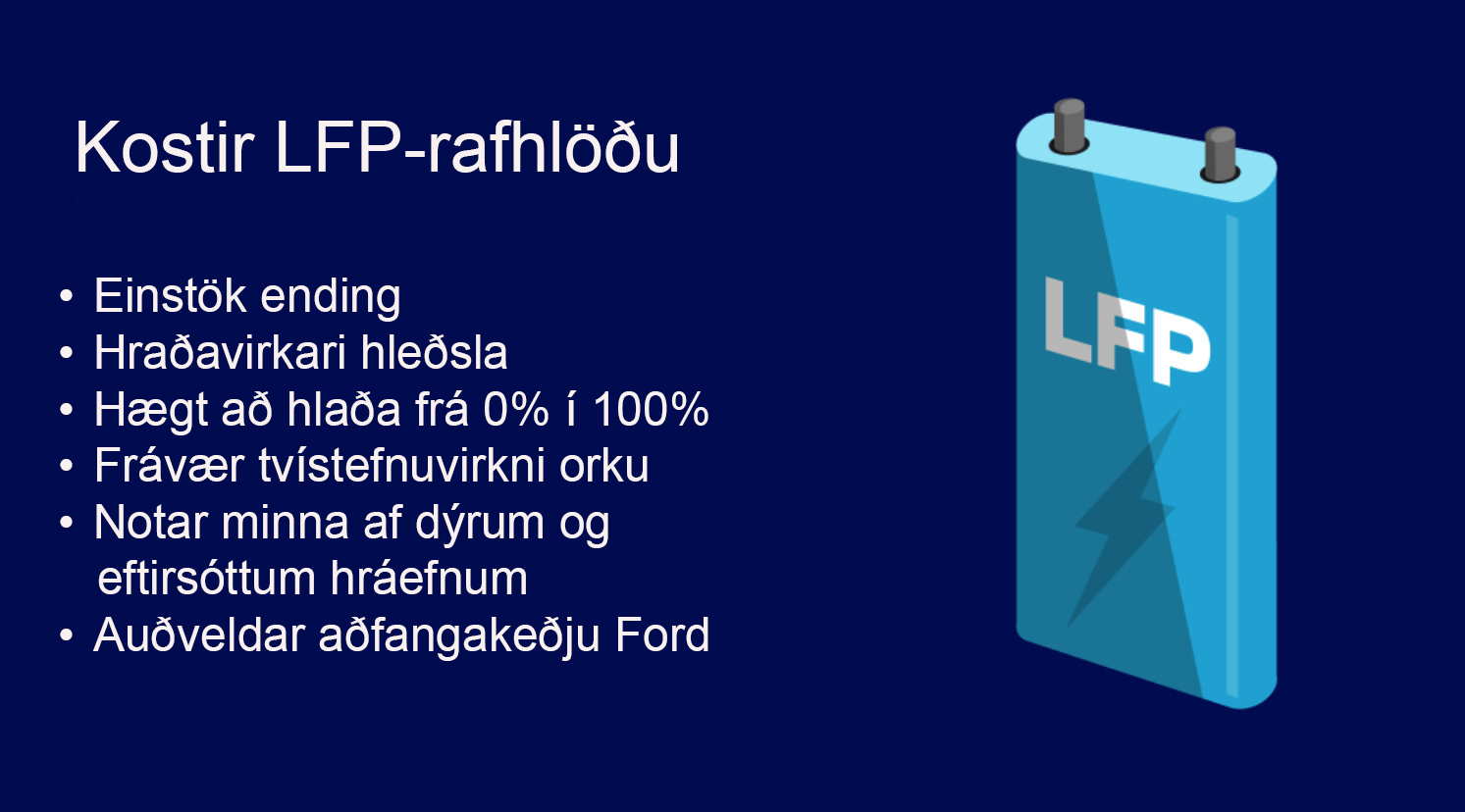 Hingað til hafa aðeins fáir rafbílaframleiðendur notað litíum járnfosfat rafhlöður. Stór notandi á markaðnum, Ford, bætist við innan skamms. Loforðið: lægri kostnaður.