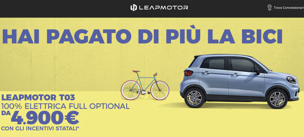 Auglýsing frá Leapmotor á Ítalíu. Auglýsing frá Leapmotor segir að T03 kosti minna en reiðhjól. (Stellantis)