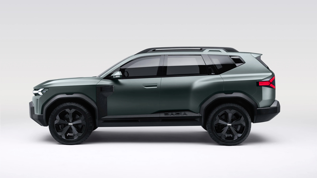 Horft frá hlið deilir Bigster nokkrum hönnunareinkennum með minni Duster jeppanum, svo sem breiða brettakanta sem hýsa stóra fimm arma álfelgur. Allur neðri hluti bílsins er með svartar plastklæðningar.