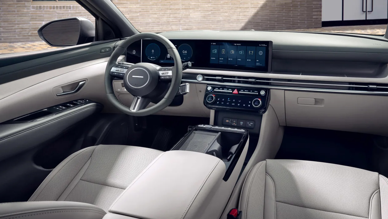 Hyundai heldur því fram að innanrýmisbreytingar bílsins skapi „samræmda blöndu af virkni og fagurfræði“. Stærsti munurinn hér er endurstilling miðlægs snertiskjás til að vera tengdur við ökumannsskjáinn – alveg eins og á nýjustu gerð Kona. Stýrið er einnig fengið að láni frá smærra systkini Tucson, með nýju merki í miðjunni.