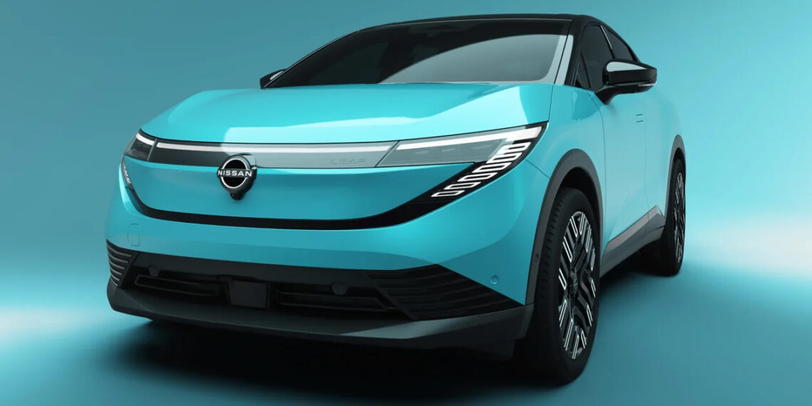 Aðrar upplýsingar eru frekar skarpt oddhvass nef með ljósastiku í fullri breidd og upplýst Nissan merki. Það eru líka innfelld handföng á framhurðunum, með afturhurðarhandföngum falin hátt uppi á C-bitanum til að gefa bílnum coupe-líkt útlit, en hleðslutengið er staðsett á vinstra frambrettinu.