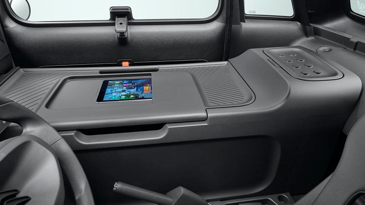 Á farmsvæðinu eru einnig nokkrir festipunktar og hæðarstillanlegt gólf, sem gerir ökumanni kleift að flytja hluti sem eru allt að 1,2 metrar að lengd. Ofan á kassanum er fest hilla á lömum sem getur borið allt að 40 kg og er líka hægt að nota sem skrifborð.