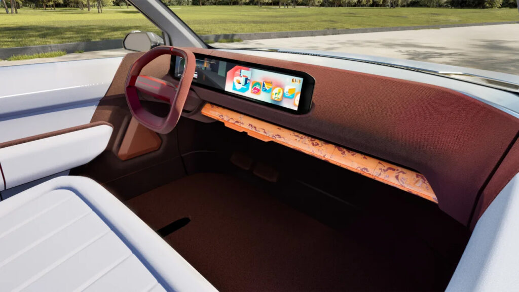 Litirnir, efnin og þrívíddarprentaðir þættirnir gætu verið svolítið framandi, en mælaborðið – með lágmarksútliti og tveimur skjám – ætti ekki að breytast mikið frá því að bíllinn verður kynntur. Afturhurðirnar, með lömum að aftan, verða ekki í boði í EV2, þó að Habib hafi sagt að móðurfyrirtækið Hyundai Motor Group sé að „vinna að því“ að bjóða það upp í framleiðsluútgáfu. „Ég get ekki sagt hvenær,“ sagði hann. „En við munum gera það; það er mjög hagnýtt.“ Rafhlaða, drægni og hleðsla